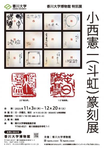 香川大学博物館では、香川大学教育学部の小西憲一(斗虹)教授の令和7年度末での退職を記念し、特別展「小西憲一(斗虹)篆刻展」を2025年11月3日(月・祝)から12月20日(土)までの会期で、当館展示室にて開催する運びとなりました。