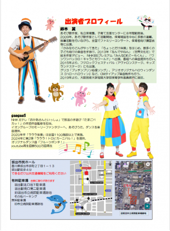 遊び歌、手遊び、絵本、パネル、ダンス、親子ふれあい遊びなど、楽しめるコンサートです。